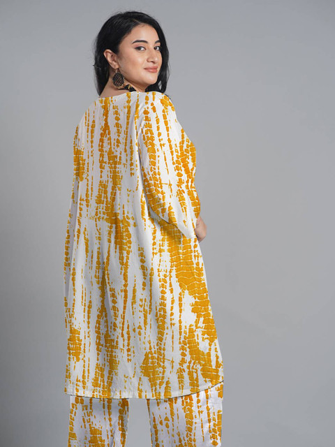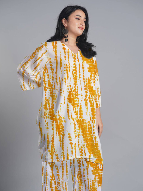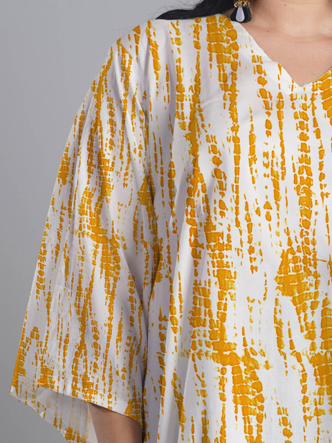 Yellow & white dyed kurta,has v-neckline, Three-quarter Bell Sleeves, straight styling, straight shape, knee length with symmetric hem, Machine weave regular Viscose Rayon