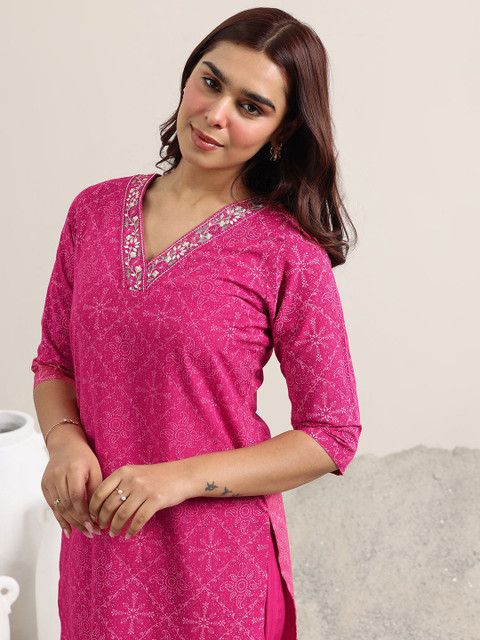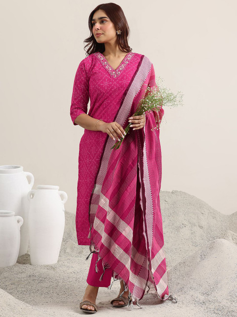 Pink, white & maroon printed kurta with trousers & dupatta
