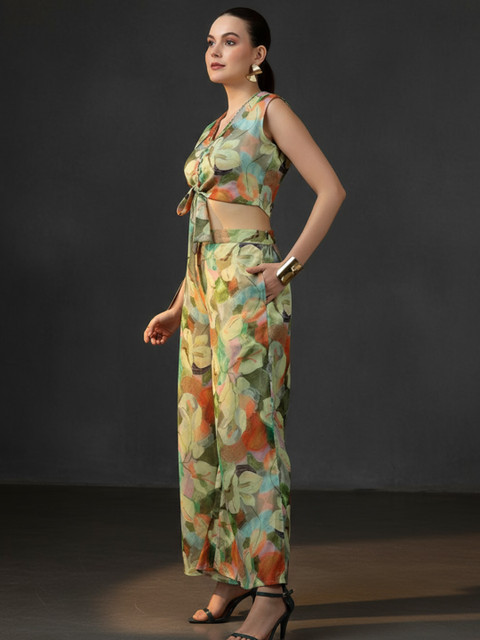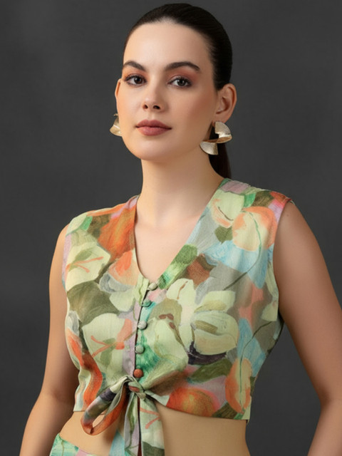 Green & red floral printed top, has V-neck sleeveless, slip-on closure and regular waist hem
