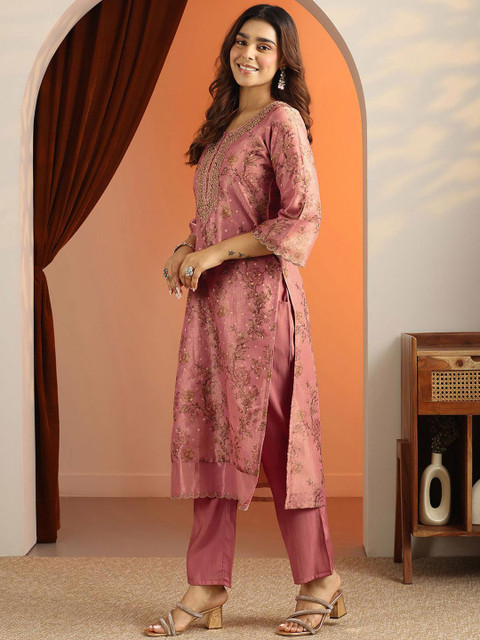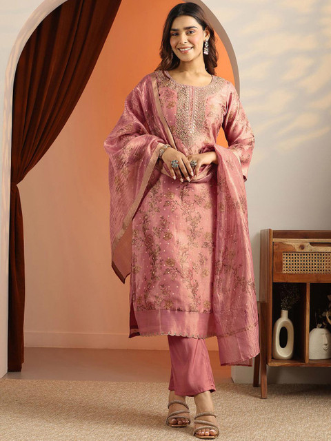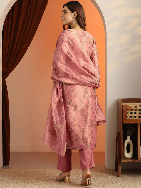 Peach-coloured printed Kurta with Trousers with dupatta