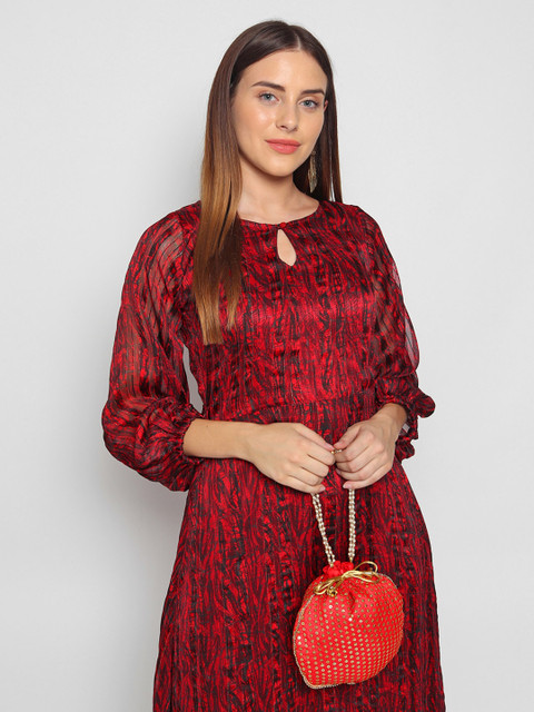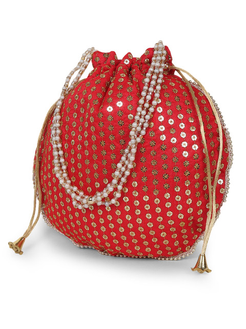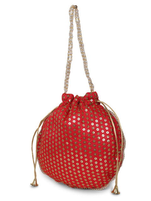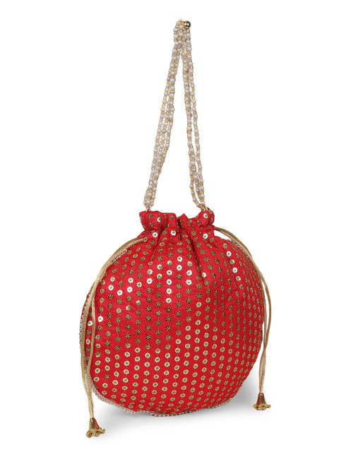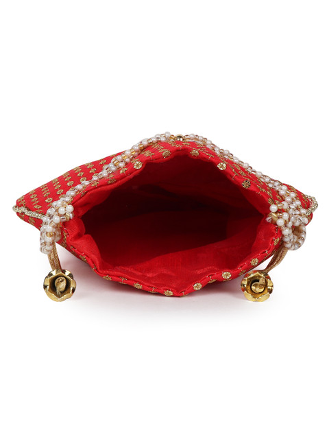 Women Bridal Red-coloured and gold Toned Work Stone-Studdded potli clutch Has wrist loop, 1 main compartment Being light weight and spacious these potli bags can easily be wrapped around the wrist using their drawstrings,