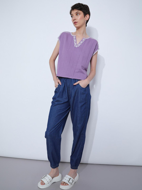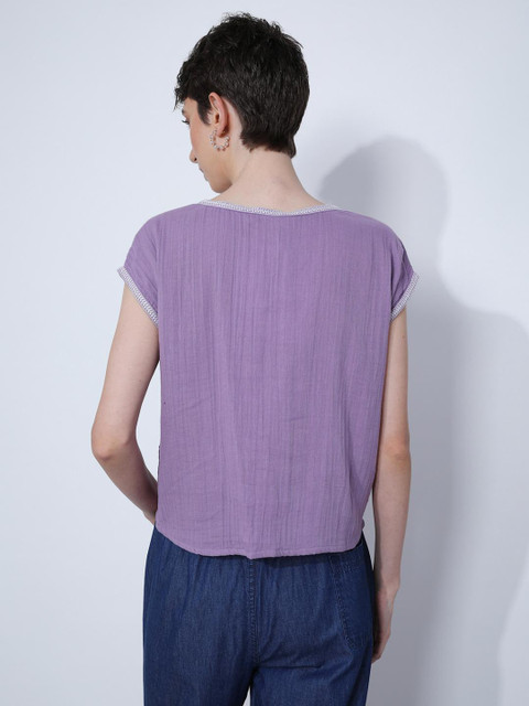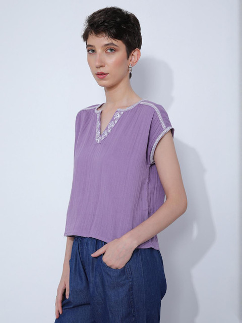 LIMEROAD Cotton Lavender Solid V neck Cap Sleeve Top
