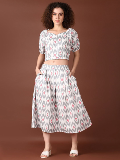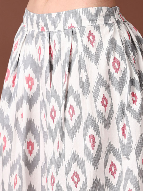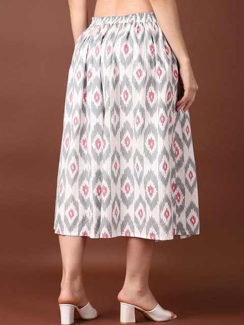 Grey printed flared midi skirt, has an elasticated waistband with slip on closure, and a flared hem