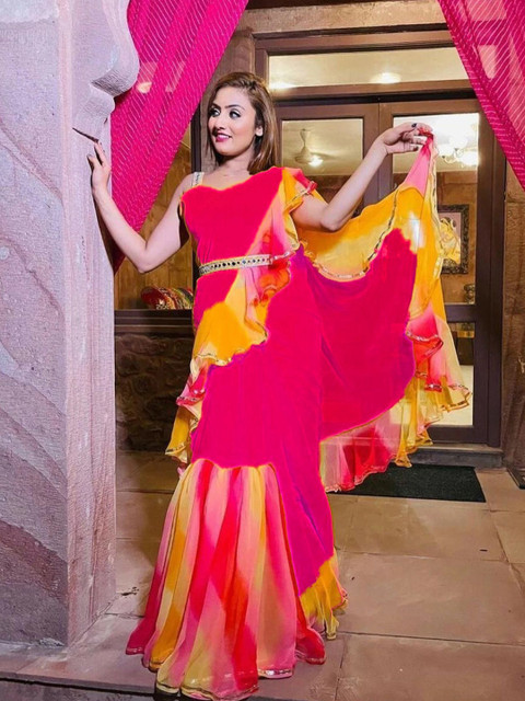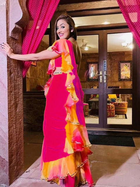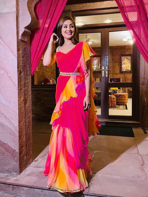 - Pink and yellow block print saree