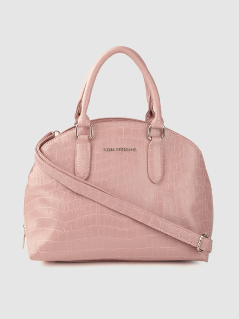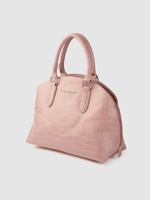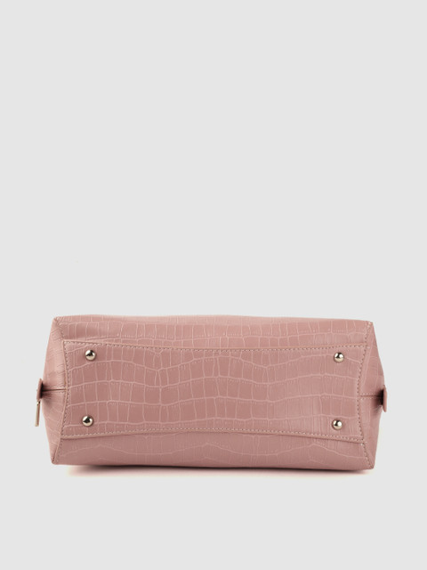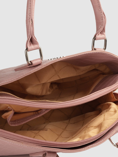 Peach-coloured croc textured handheld bag 3 main compartments, has a zip closure, 3 inner pockets