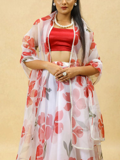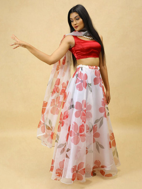 White, pink and red printed semi-stitched lehenga, flared hem