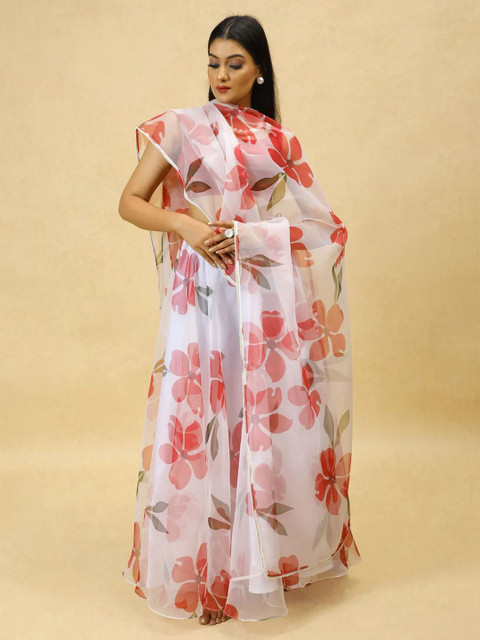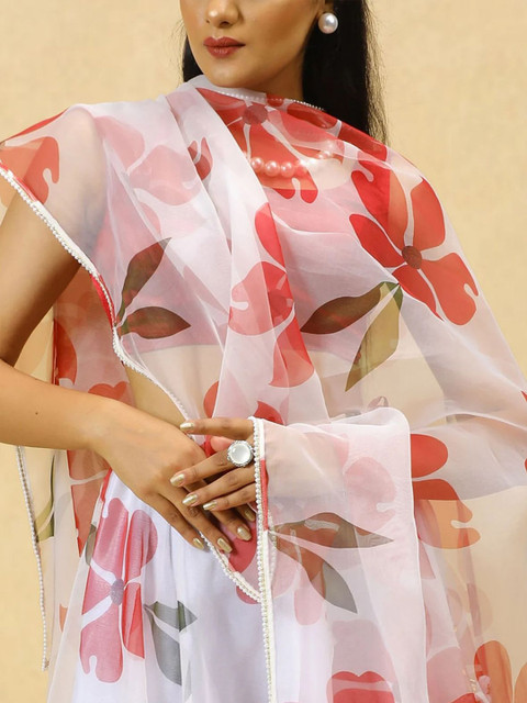 White, pink and red printed dupatta, taping border