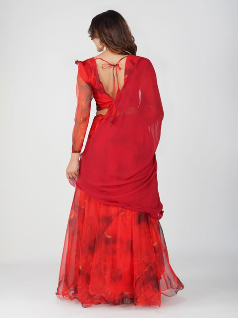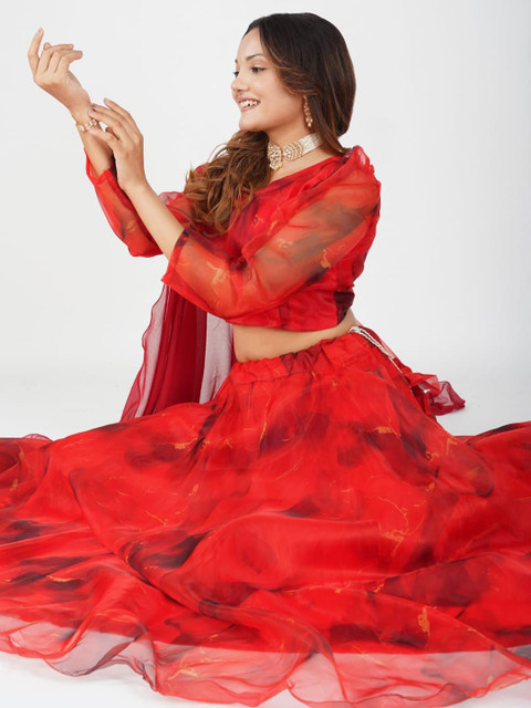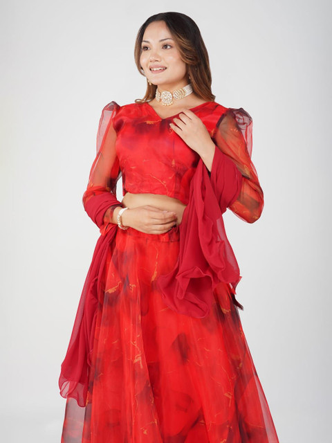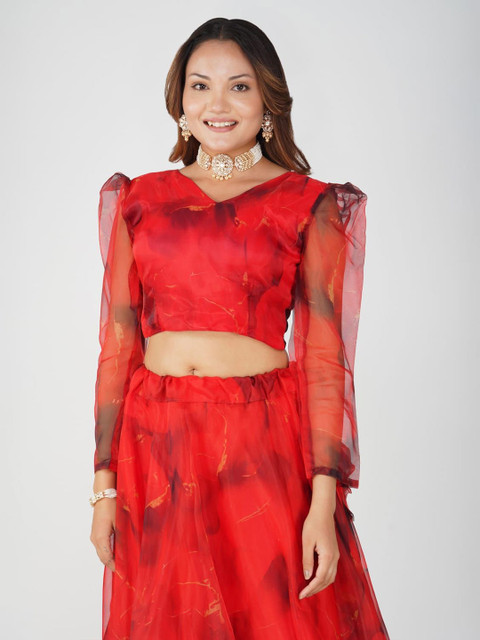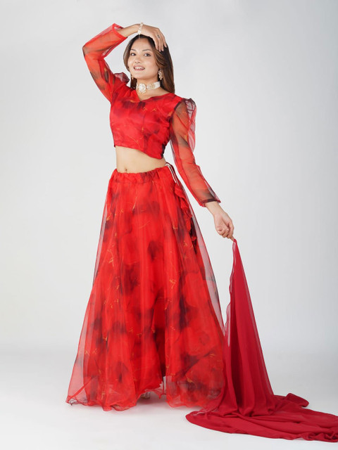 Red and black printed ready to wear blouse, has a v-neck, long sleeves, red and black printed semi-stitched lehenga, flared hem