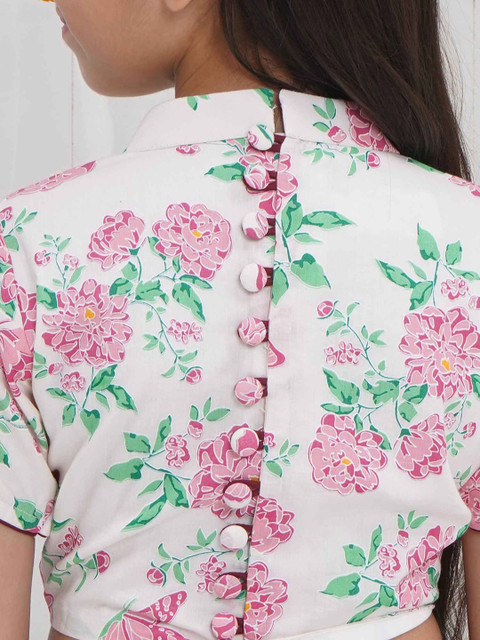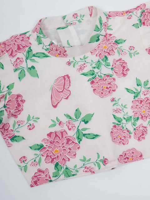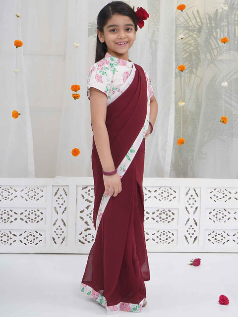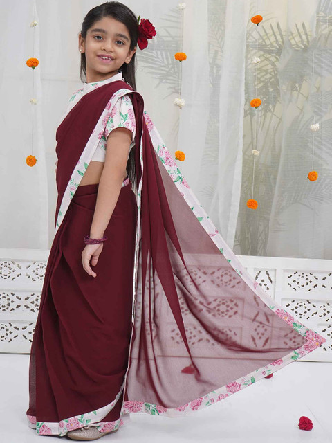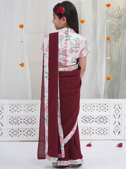- Little Bansi Georgette & Cotton Short sleeves Floral Butterfly Blouse with Saree – Maroon