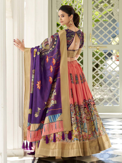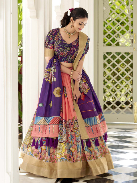 Peach-coloured and purple printed lehenga choli with dupatta,
