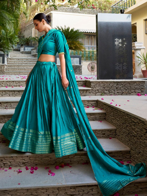 | Style Tip | Match your jewellery to the existing embellishments. Since this lehenga has gold-toned accents, stick to gold, kundan, or pearl jewellery to create a cohesive look. |
