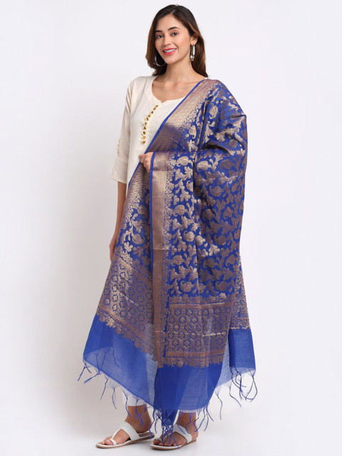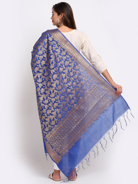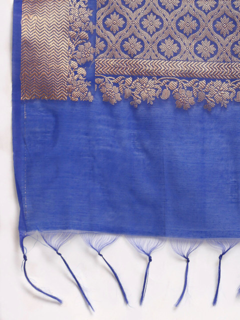 Blue and gold-toned ethnic motifs woven design dupatta zari, tasselled border