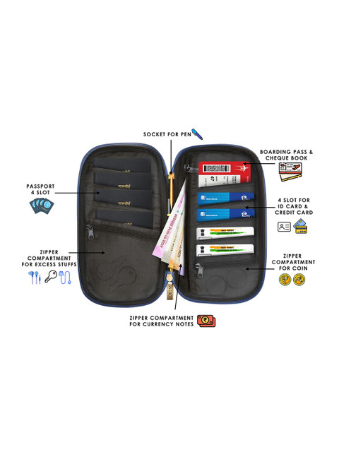 4 Travel Passport + 4 ID / Bank Cards + Currency Compartment (Zip) + Boarding Pass / Cheque Book + Pen + Phone (Outside Front Pocket) + Keys (Zip) + Coins (Zip) & Small Gadgets (Zip).