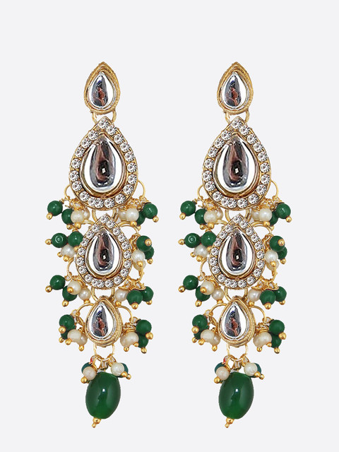 Gold-toned & green leaf shaped drop earrings, gold-plated, has kundan