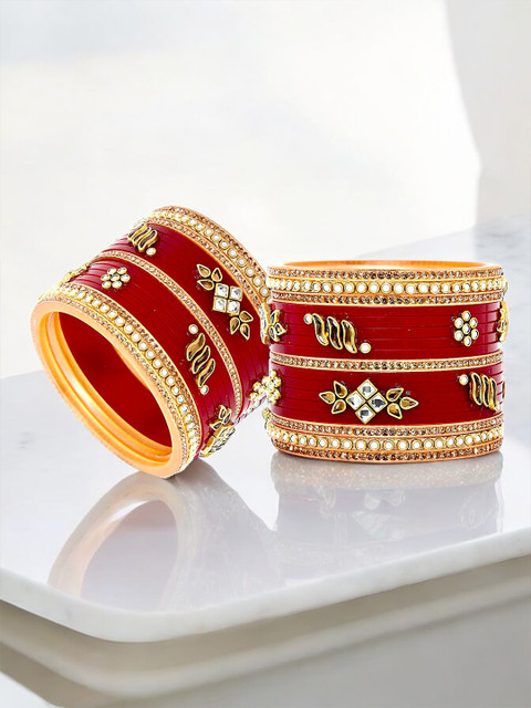 Gold-toned & maroon kundan beaded choora Bangles, secured with slip-on closure