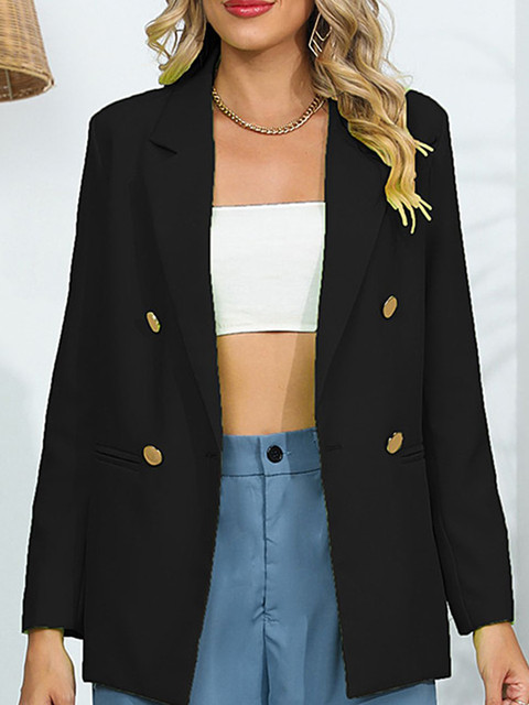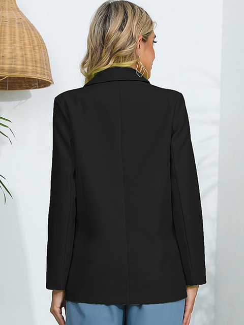Black solid regular-fit double-breasted blazer, has a notched lapel collar, long sleeves, two flap pocket, and straight back hem.