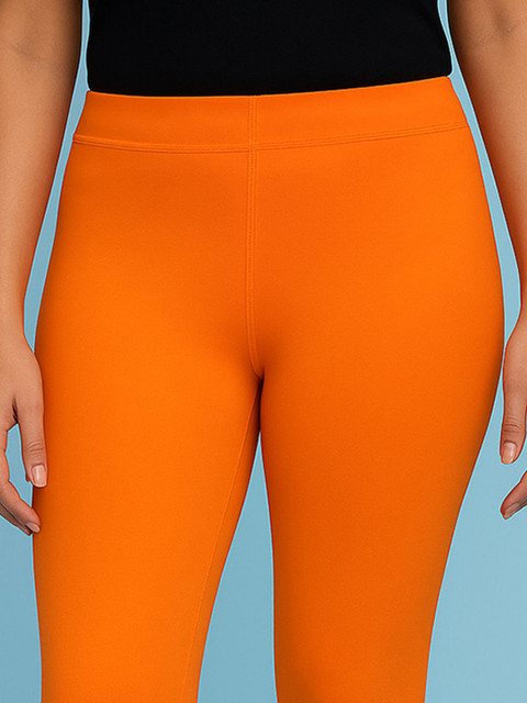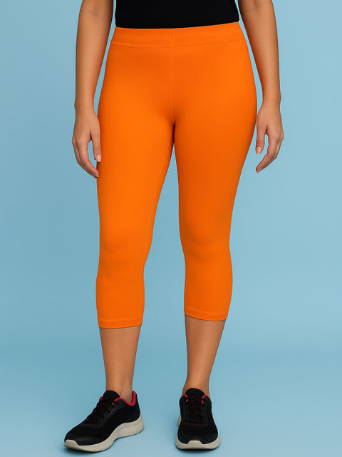 Orange-coloured solid three fourth length capris has an elasticated waistband with slip on closure