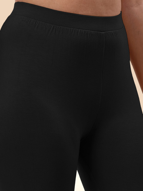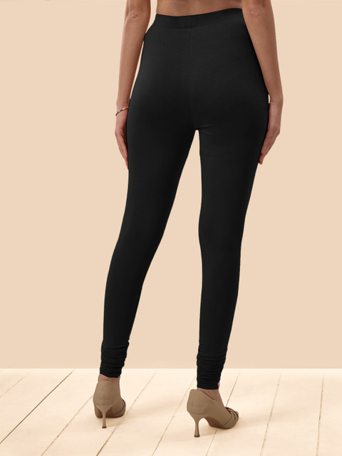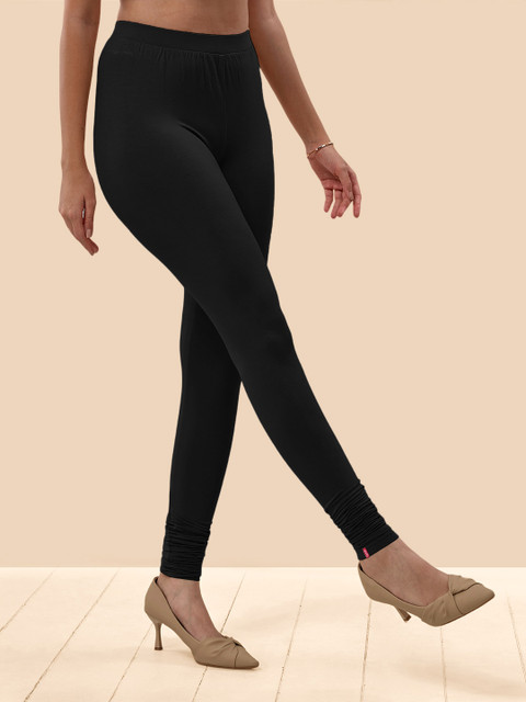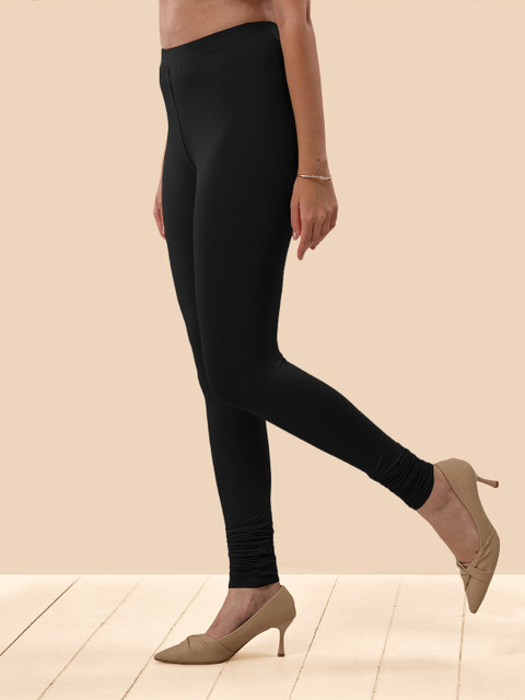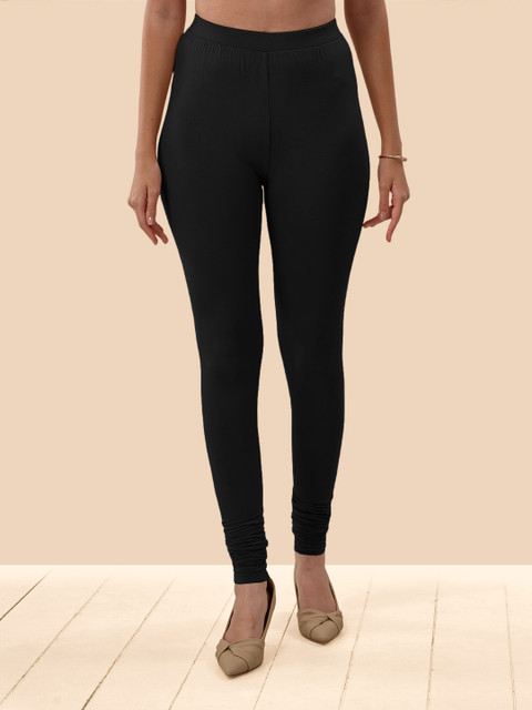 Black solid churidar-length leggings, has an elasticated waistband and slip-on closure