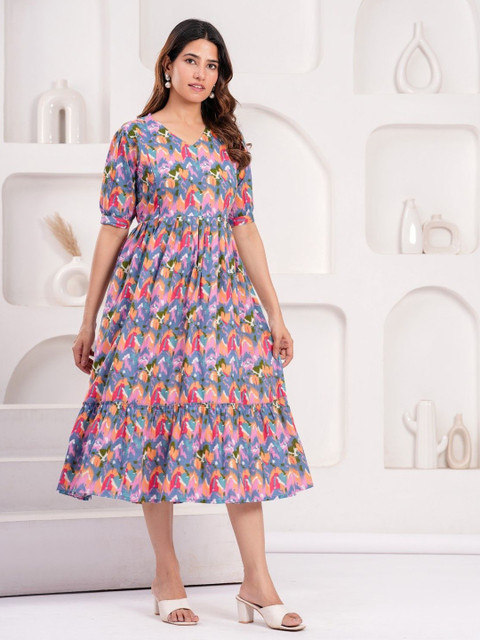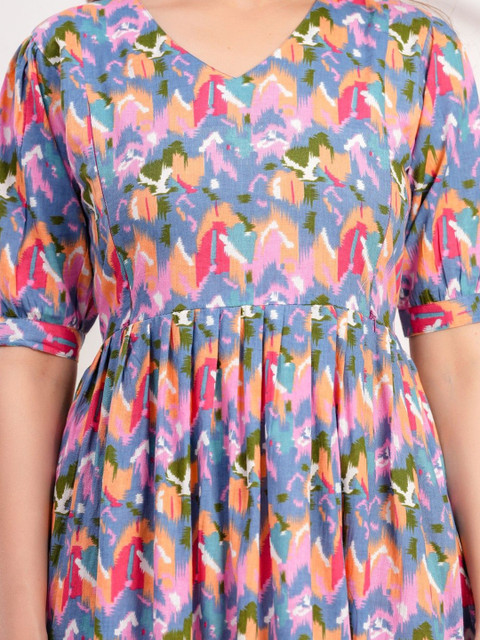 3 reviews for mad fury Women Printed Puff Sleeve Maternity Pure Cotton Fit and Flare Midi Dress