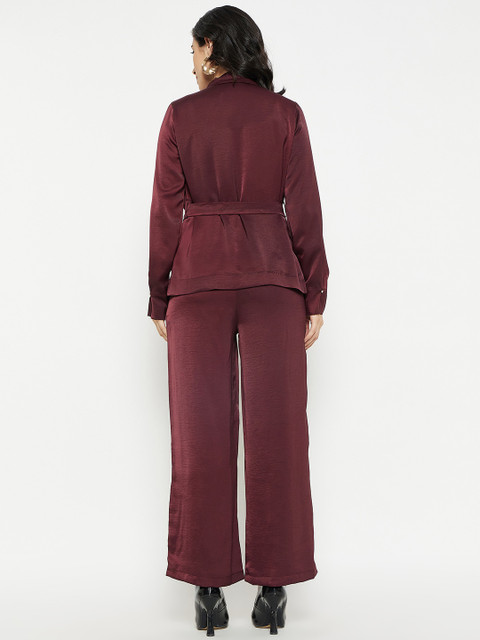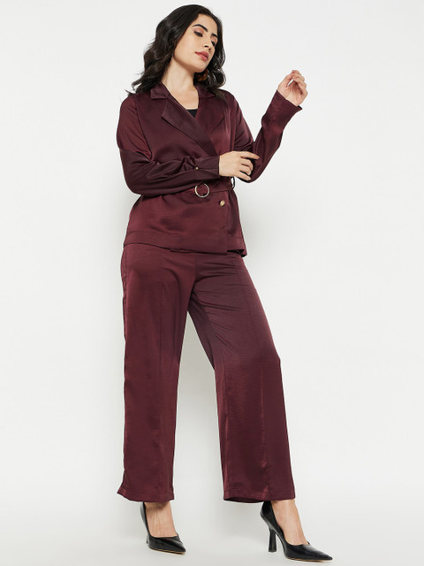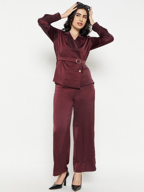 Wine maroon solid regular-fit blazer, has a notched lapel, long sleeves, single-breasted with double button closure and a double-vented back hem