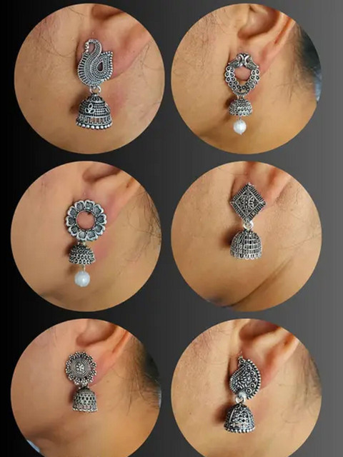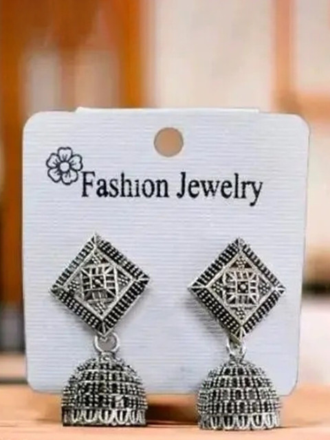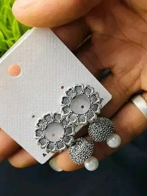 Silver-toned dome shaped oxidised jhumkas, silver-plated, has artificial beaded details