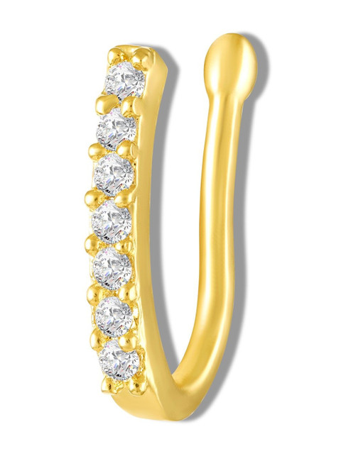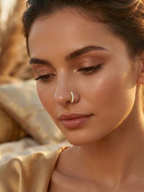 Add a touch of everyday elegance with this Mahi floral nose pin crafted in a rich gold-tone finish. The charming flower motif features a brilliant center stone surrounded by shimmering crystal accents, creating a classic sparkle that complements both ethnic and western looks. Designed in a comfortable hook style for a secure fit, its a perfect choice for daily wear, festive styling, and gifting.