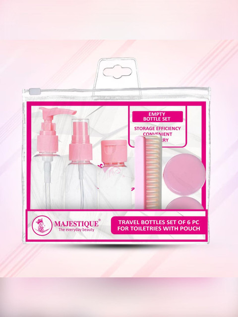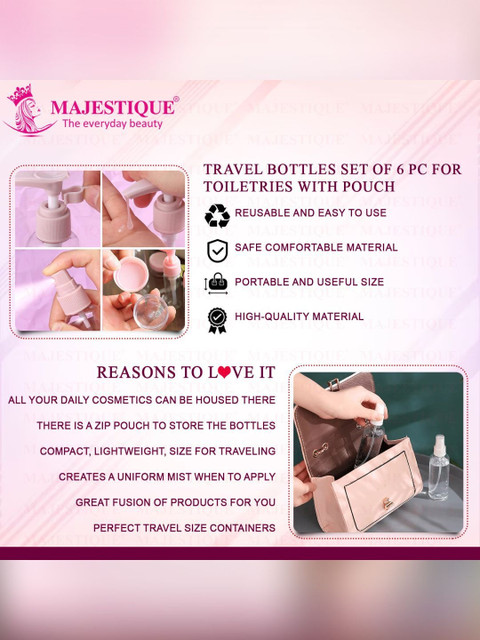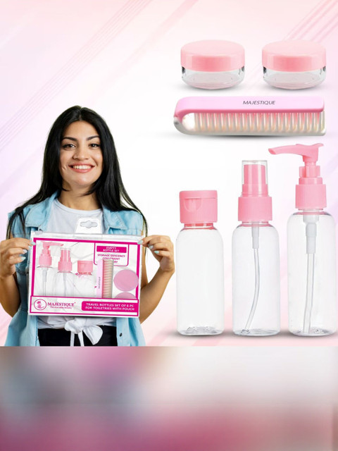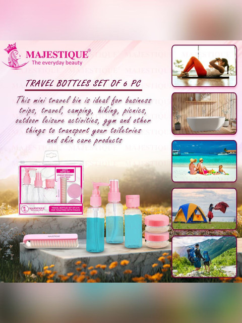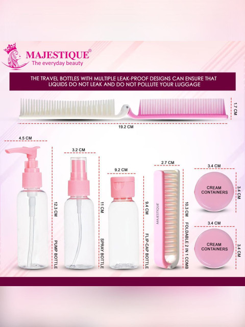 This travel kit includes 6 essential containers: pump bottle, spray bottle, cap bottle, 2 cream jars, and comb, neatly packed in a convenient, reusable pouch. A complete travel kit for toiletries with secure lids and leakproof design, making it perfect for carrying shampoo, lotions, perfumes, and creams safely during your trips. Premium travel bottle kit for toiletries designed with refillable, eco-friendly bottles and jars, ensuring hygiene, durability, and sustainability while travelling for business or holidays. Compact travel kit for women that easily fits in handbags, backpacks, or carry-on luggage, offering convenience and organisation wherever you go. Lightweight, reusable, and stylish travel toiletry bottles kit, perfect for shampoos, conditioners, serums, and other liquids, ensuring mess-free and organised packing.