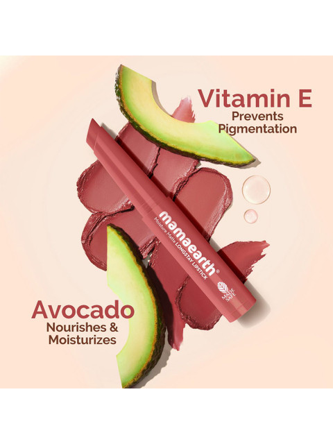 Mamaearth lipstick is smooth creamy matte or soft matte finishes, comfortable, non drying formulas enriched with nourishing ingredients like vitaminE,avocoda oil, long lasting wear.The colour are vibrant and colour payoff in one stroke.free from parabens ,mineral oil and harmful chemical s .suitable for everyday wear and for various indian skin tone. Dermatologist tested lipstick.