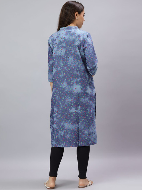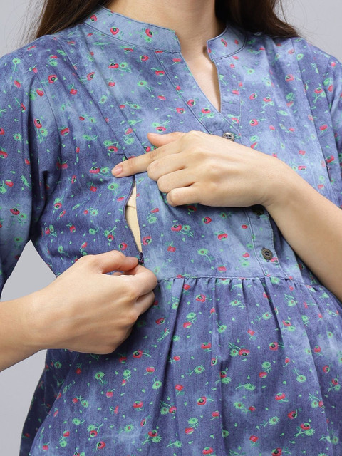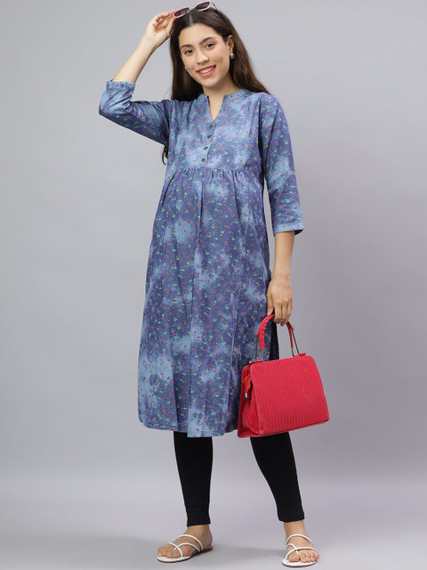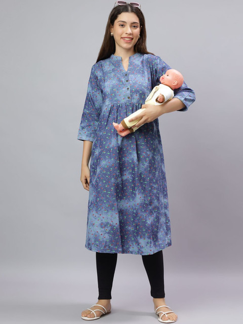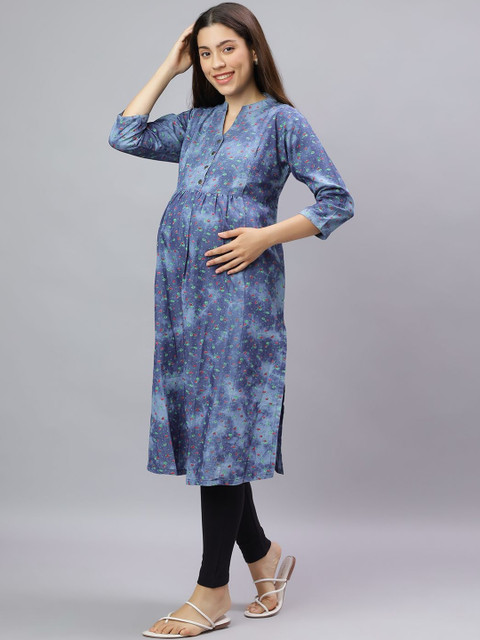 Mammas Women Blue Pure Cotton Printed V-Neck Maternity Kurti