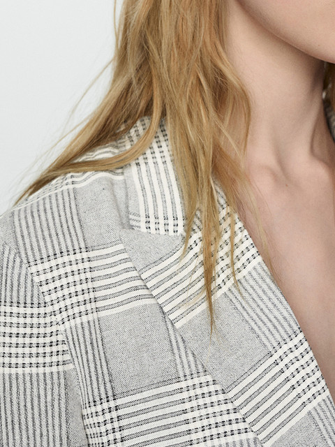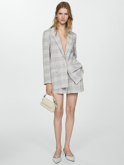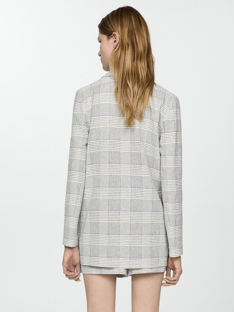 Grey and white checked blazer, has notched lapel collar, straight fit, single-breasted closure, longline length