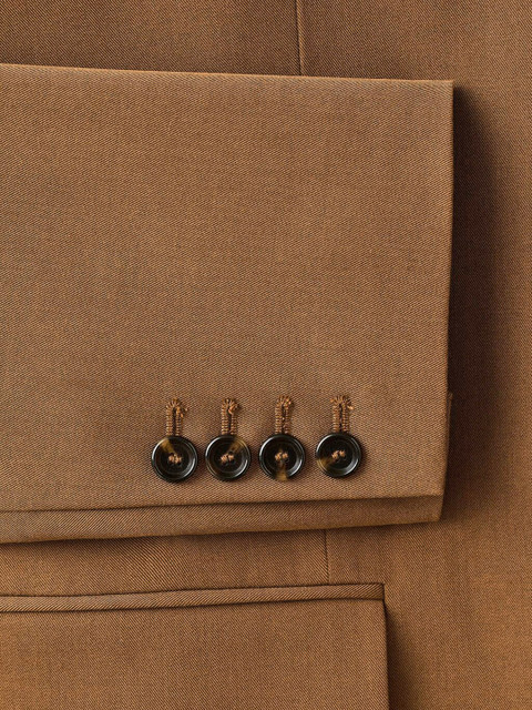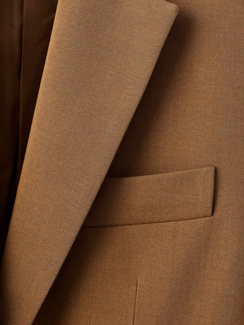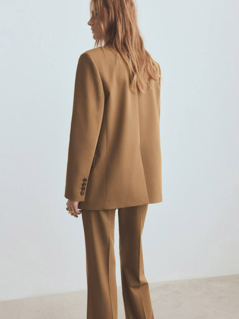 Brown coloured blazer, notched lapel collar, 3 pockets, button closure, regular length, single back vent