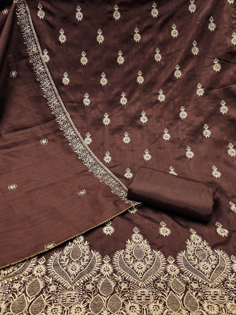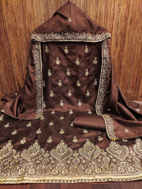 Brown and gold-toned ethnic motifs embroidered zari work unstitched dress material