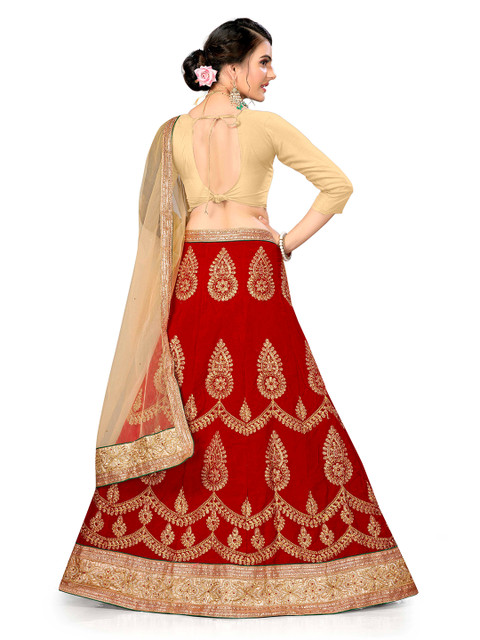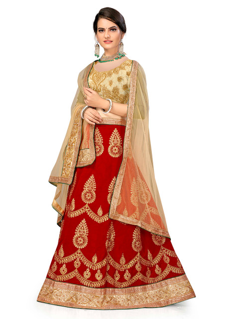 Red and gold-toned embroidered semi-stitched lehenga, flared hem