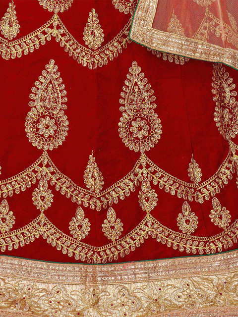 Red and gold-toned embroidered lehenga choli with dupatta, beads and stones