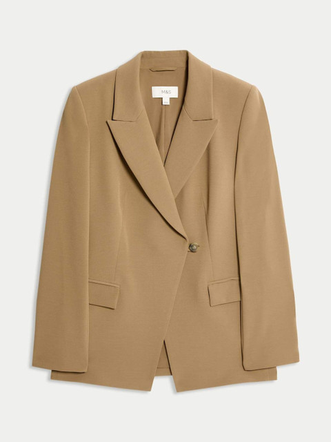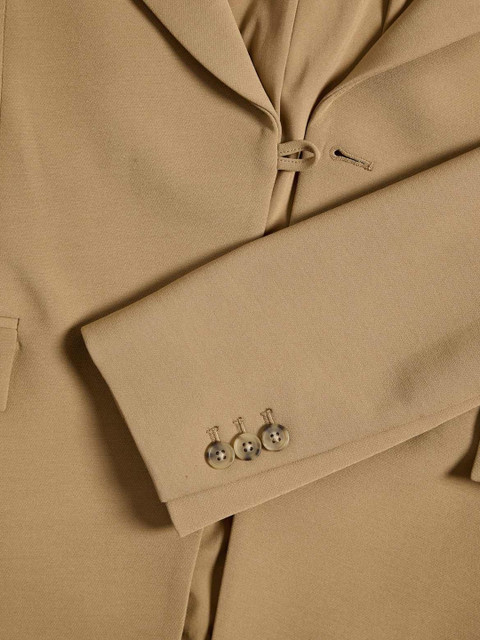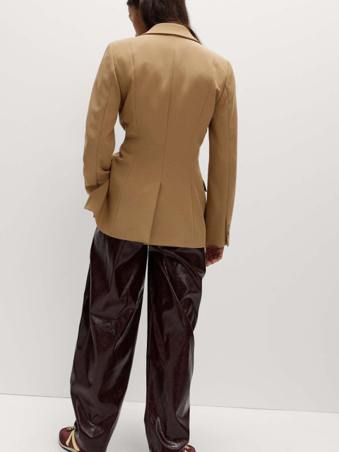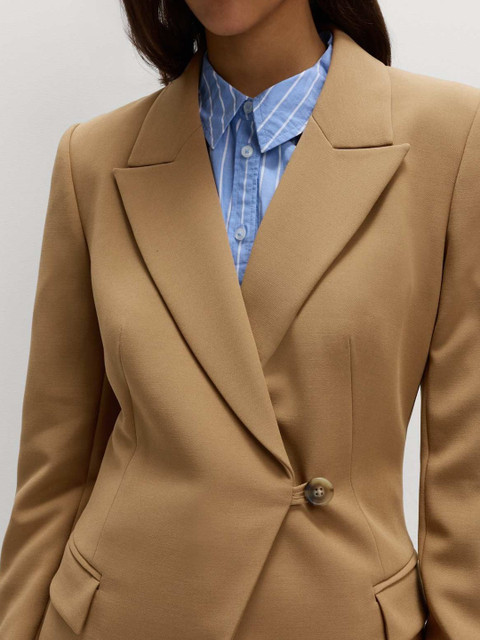 Brown solid tailored -fit formal blazer, has a notched lapel, long sleeves, single-breasted with double button closure, two flap pockets, and a double-vented back hem