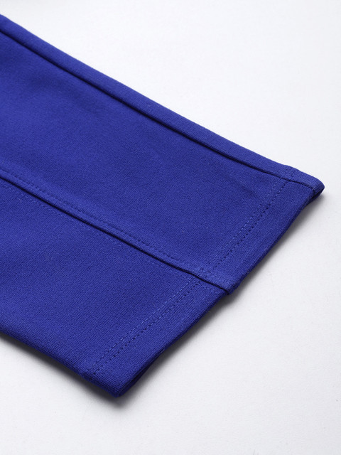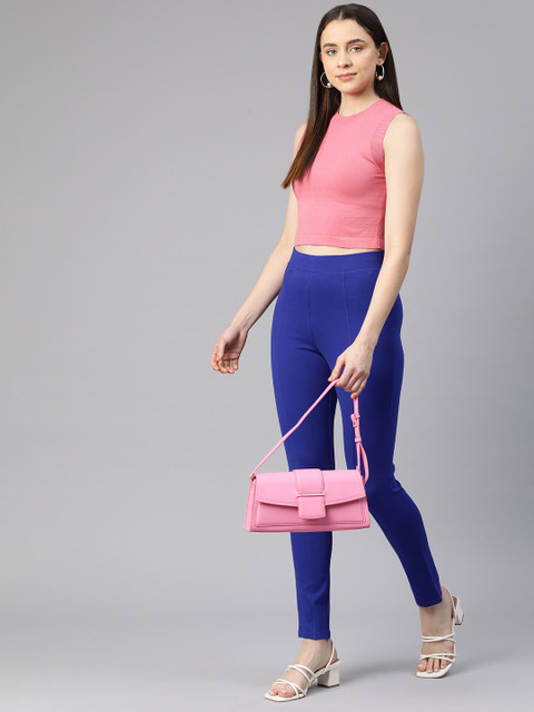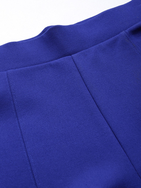 Blue solid slim fit treggings, has a slip-on closure, ankle-length, and knitted fabric