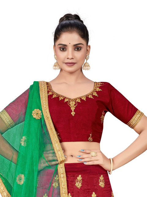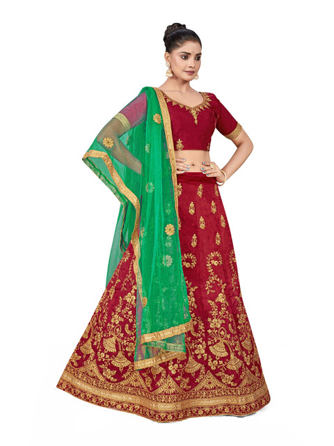 Maroon, gold toned and green embroidered lehenga choli with dupatta, thread work