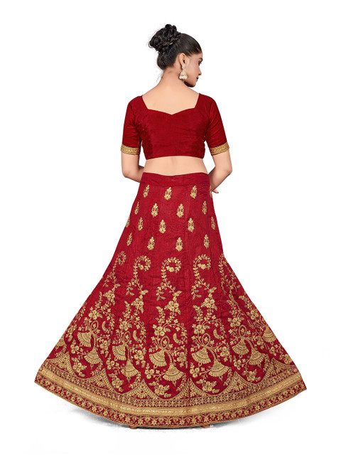 Maroon and gold toned embroidered unstitched lehenga, flared hem