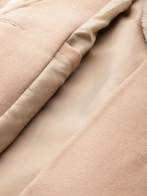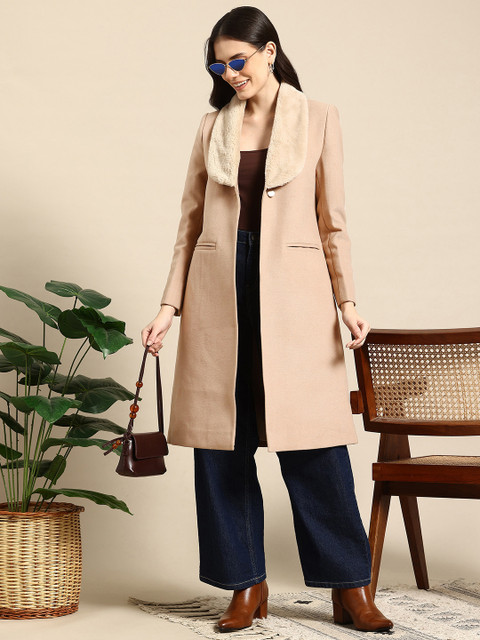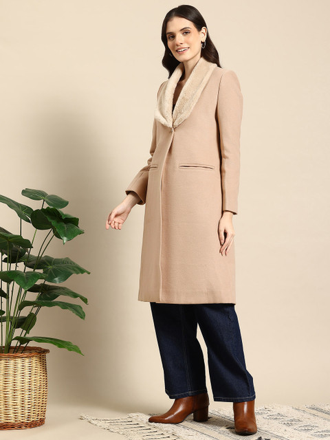 Beige solid woven longline overcoat, has a faux fur shawl lapel, long sleeves, button closures, 2 pockets, and an attached lining with inner pocket