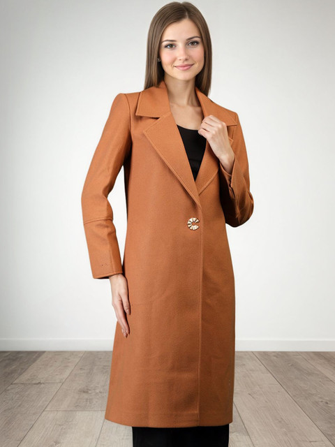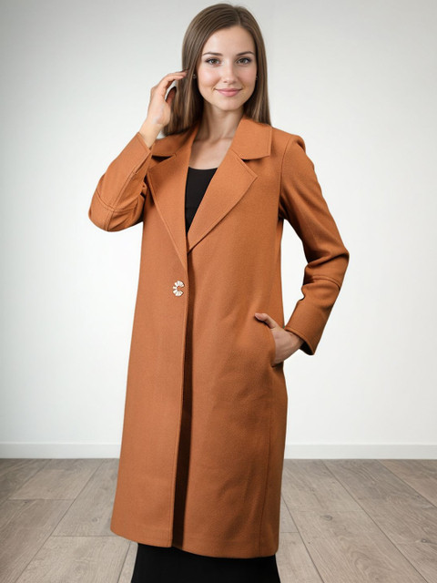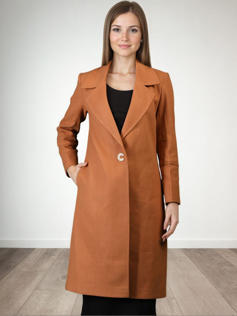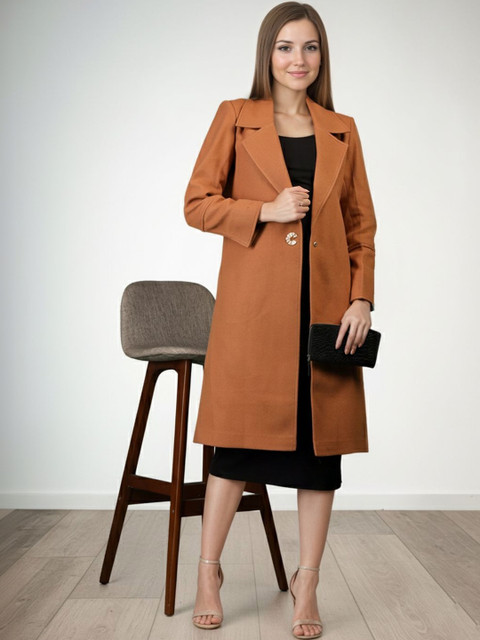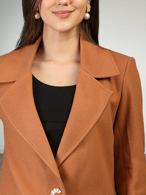 Brown solid single-breasted overcoat, has notched lapel collar, long sleeves, button closure, a straight hem with pockets
