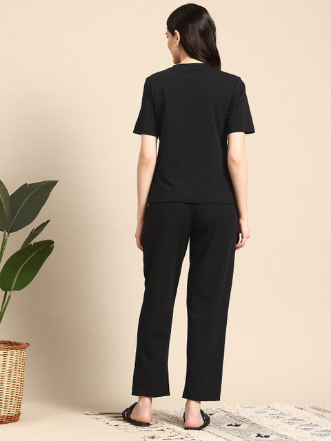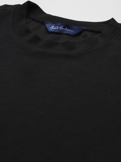 - Black solid T-shirt, has a round neck, short, regular sleeves