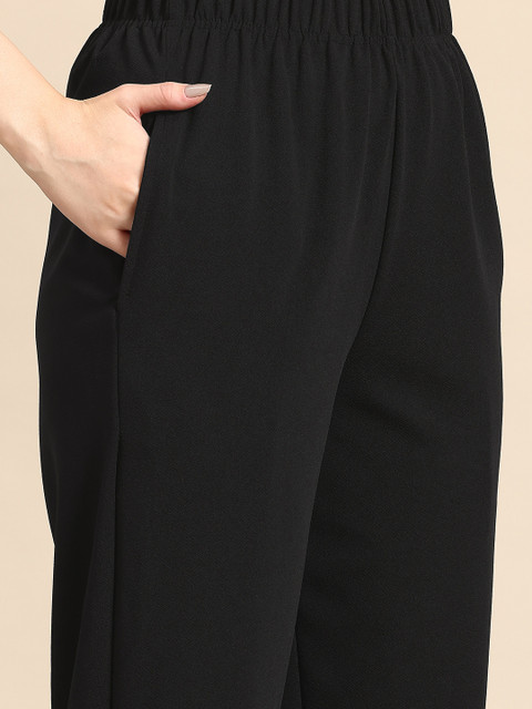 - Black solid Trousers, has 2 pockets and a elasticated waistband with a slip-on closure