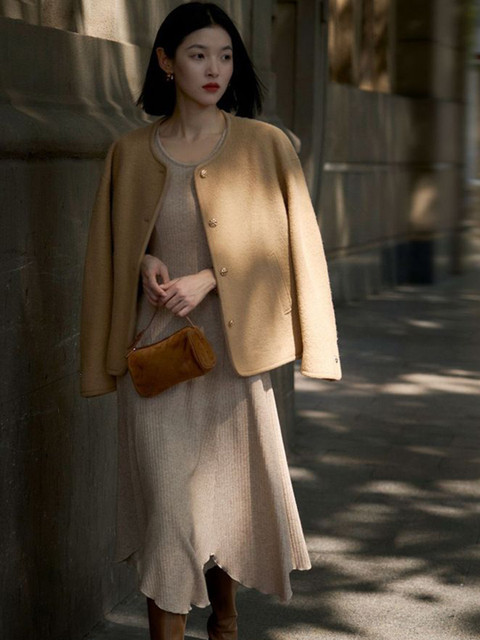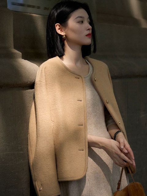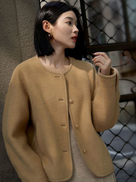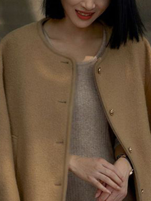 Camel brown solid coat, has a round-neck, full sleeves, front button closure and straight hem