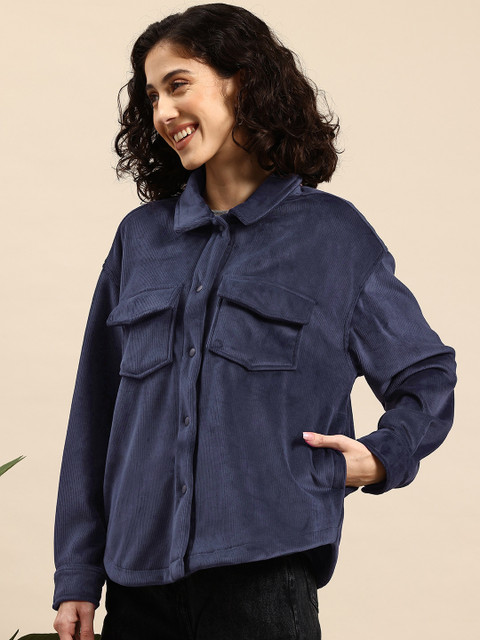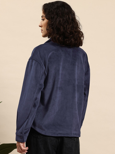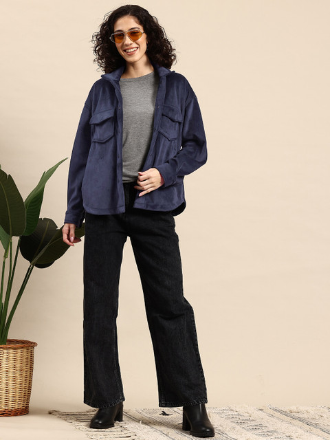 Navy blue solid tailored jacket, has a spread collar, 2 pockets ,has a button closure, long sleeves, straight hemline, without lining engineered with no