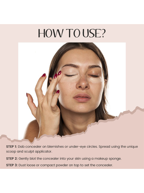 | How-to-Apply | Take the tone of concealer that matches to your skin tone. Take the product on a concealer brush and start applying on the areas that require concealing 3. Blend well into the skin. Let it settle on skin and set it with a loose powder or compact powder. |