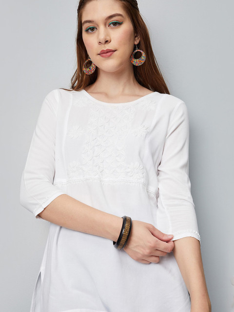 This white kurta strikes the perfect balance between understated style and refined elegance. Its delicately embroidered front brings a subtle charm, while the soft, breathable fabric promises comfort from morning to evening. Designed with easygoing three-quarter sleeves and a loose, airy silhouette, it’s well-suited for everything from laid-back lunches to festive get-togethers. Teamed with classic black trousers, the look comes together effortlessly—simple, sophisticated, and just right for those sunny daytime moments.