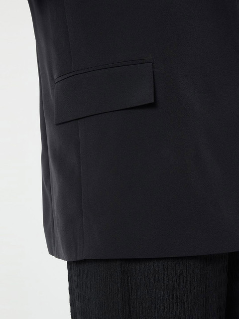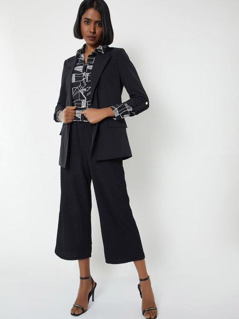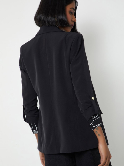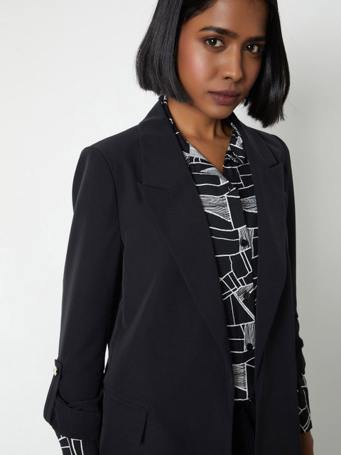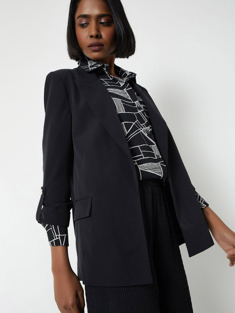 Black solid regular-fit smart-casual blazer, has a notched lapel, long sleeves, single-breasted with front open closure, two flap pockets, and a double-ventless back hem