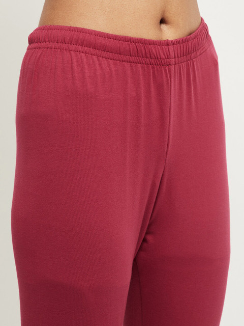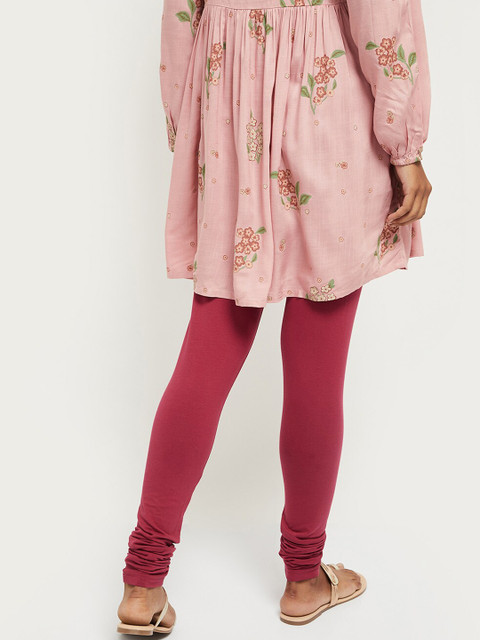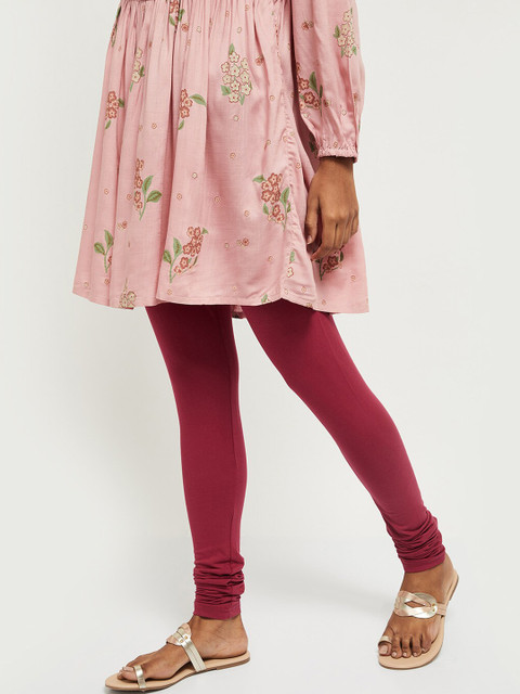 Maroon solid churidar-length leggings has an elasticated waistband and slip-on closure