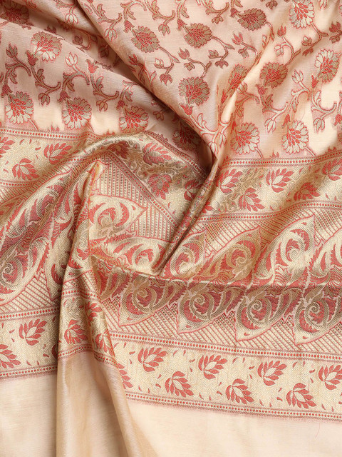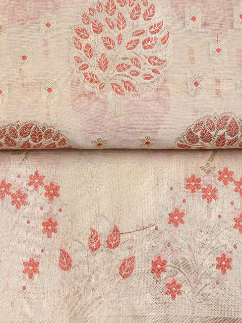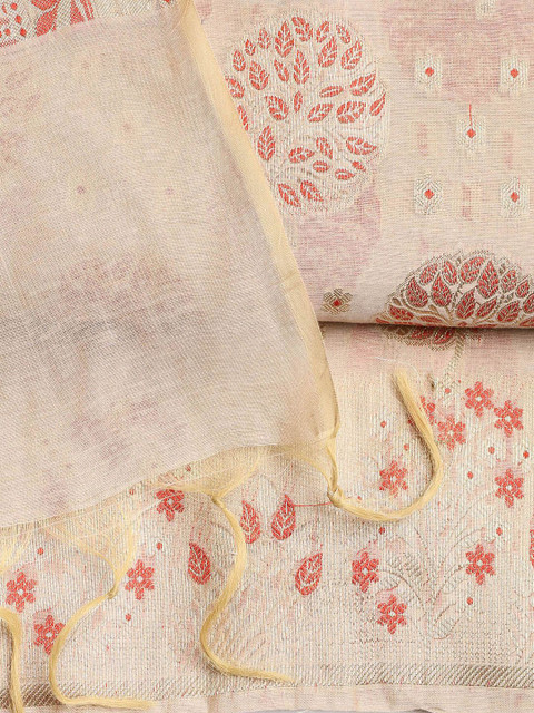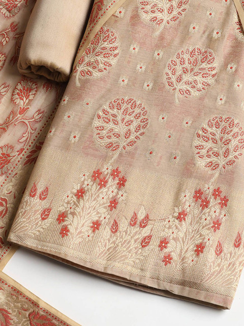 Beige, red and gold-toned woven design unstitched dress material, has zari detail