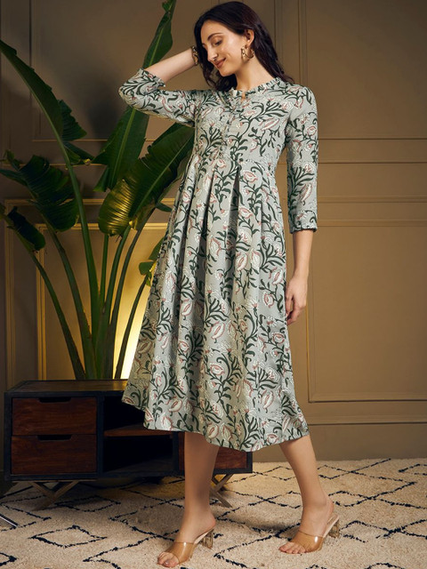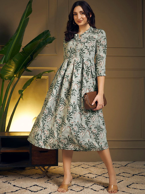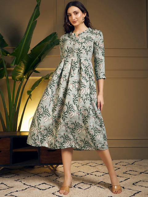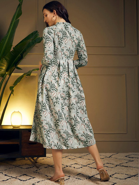 Grey-Coloured printed knitted and woven midi dress, has a round neck, three-quarter sleeves, button closure,, flared hem